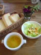ランチはスープとサラダ、パン、ドリンクがついてるセット。 サラダには三次産のパプリカが入っていて地元の食材を使っているそうです。 この日のスープは 『かぼちゃの冷製スープ』でした☆ |